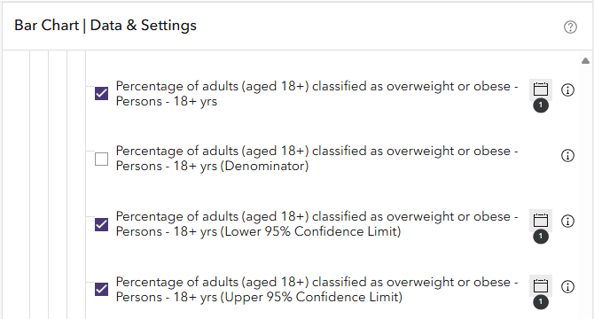 The indicators selected under the Data tab are as shown in the image below. The first indicator provides the values used to draw the chart bars, and the second and third indicators provide the values used to draw the lower and upper confidence limits respectively.