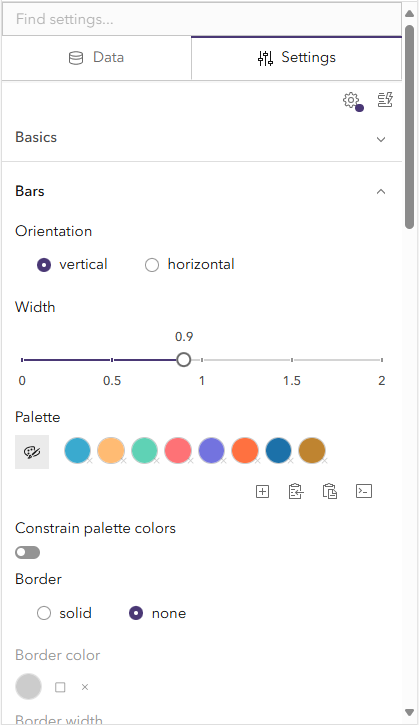 The Data & Settings panel is located on the right and shows the information for the widget that is currently selected in the report (if not widget is selected this panel will be hidden). It allows the author to choose the data that will be shown in this widget and to change settings in order to control how this data will be displayed. The width of this panel can be changed by clicking and dragging the left border of the panel.